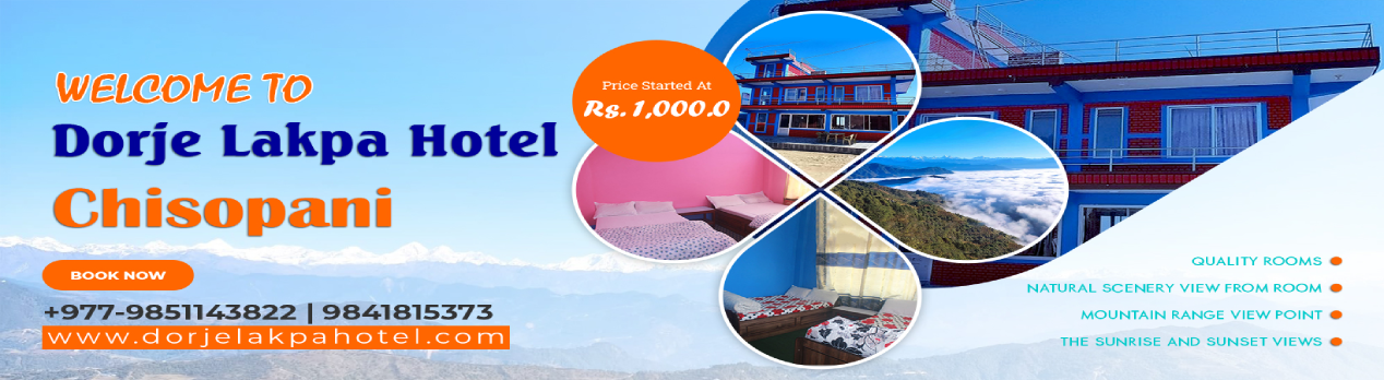 Hotel Dorje Lakpa is located in the beautiful place of Chisapani, Melamchi -03, Sindhupalchowk. It is one of the best hotels to stay and enjoy in Chisapani. Good hospitality, hygienic food, a Peaceful environment etc. are the attraction of this hotel.